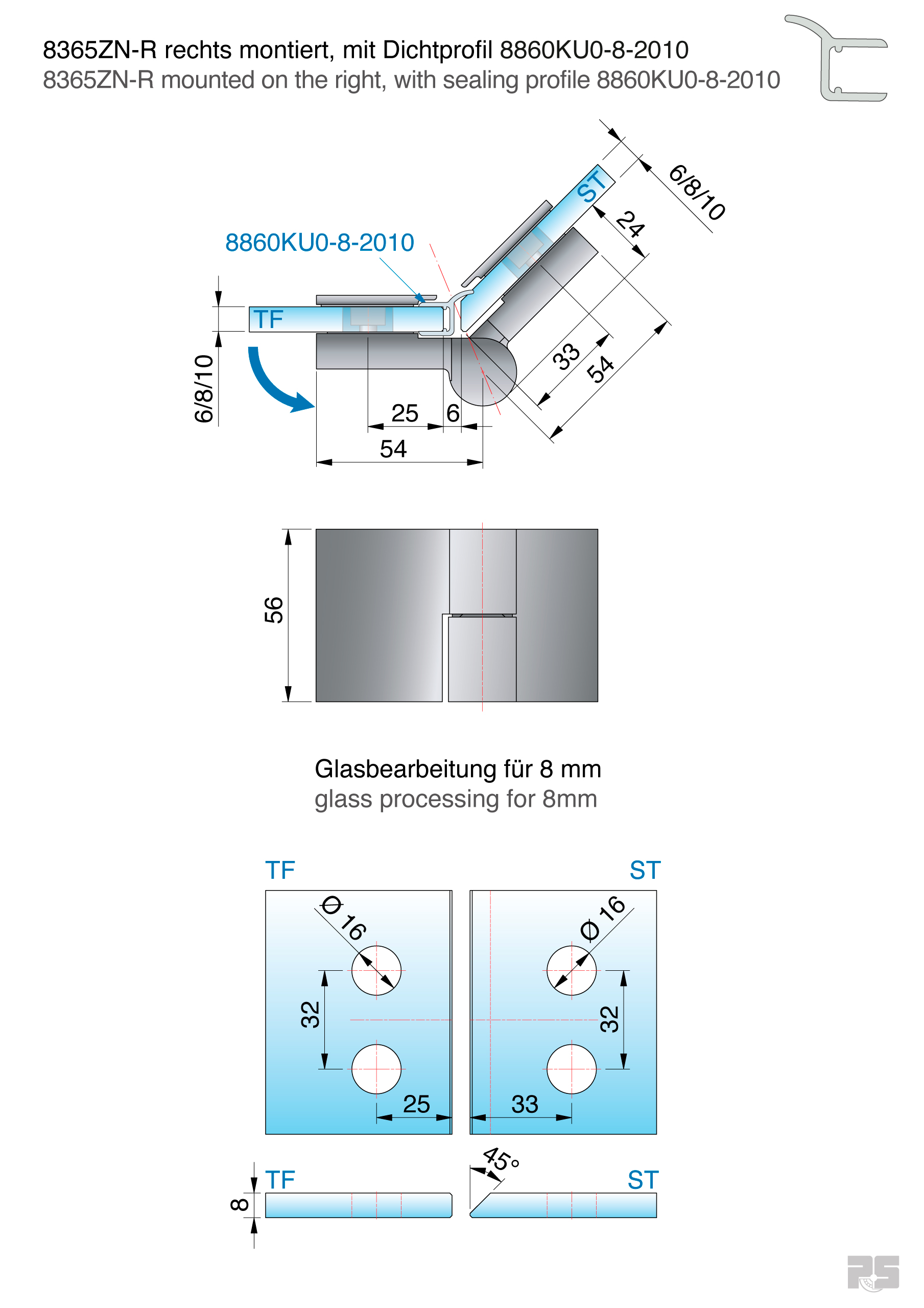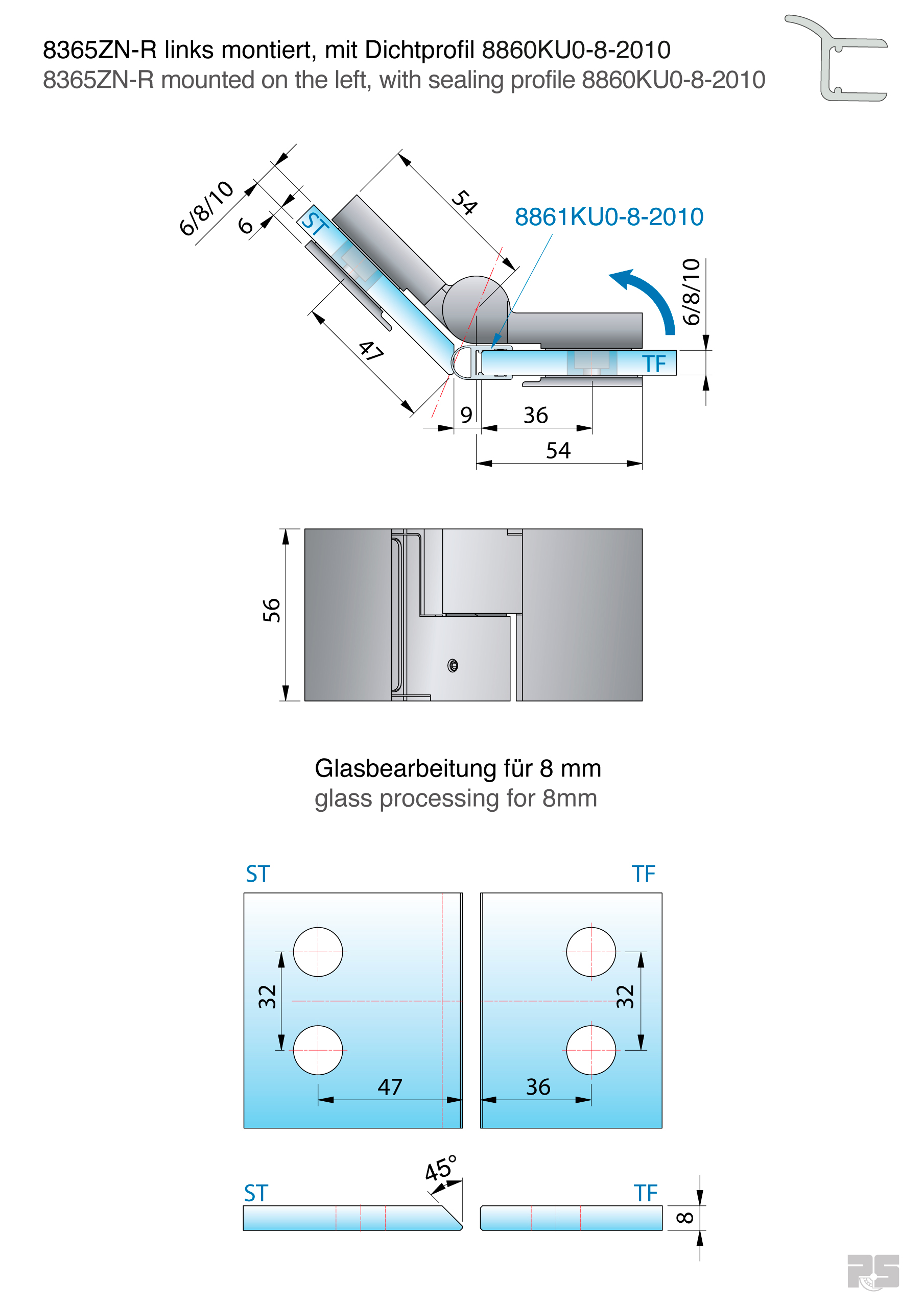 rechts montiert, 135° öffnend, Glasbefestigung flächenbündig, verdeckte Verschraubung mit Abdeckkappe, Punkthalter unabhängig voneinander ± 2 mm in jede Richtung verstellbar, Nulllage einstellbar, Tragkraft/Paar: 36 kg