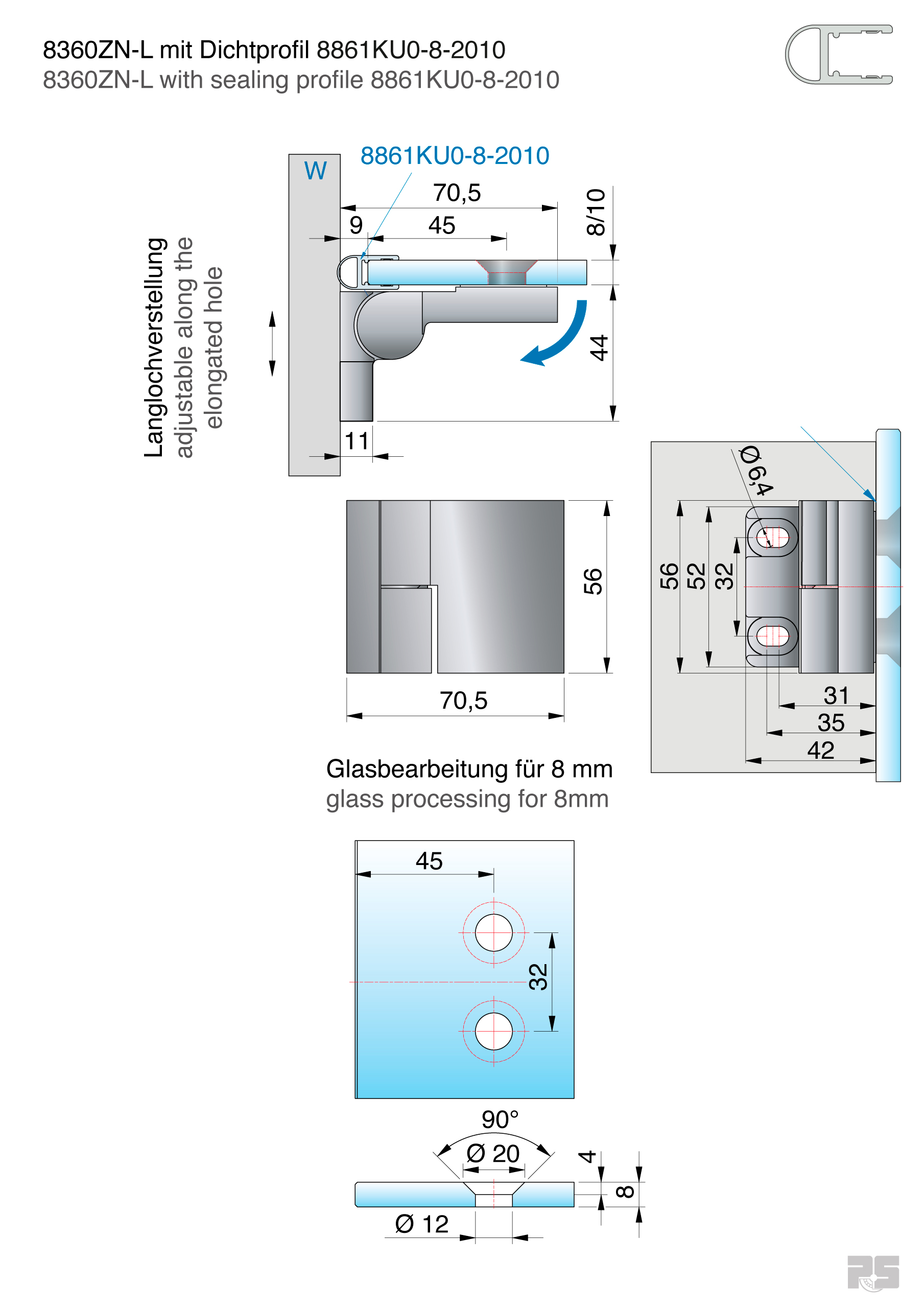 links montiert, 90° öffnend, Glasbefestigung flächenbündig, Wandbefestigung außen mit Langlochverstellung, verdeckte Verschraubung mit Abdeckkappe, Punkthalter unabhängig voneinander ± 2 mm in jede Richtung verstellbar, Nulllage einstellbar, Tragkraft/Paar: 36 kg