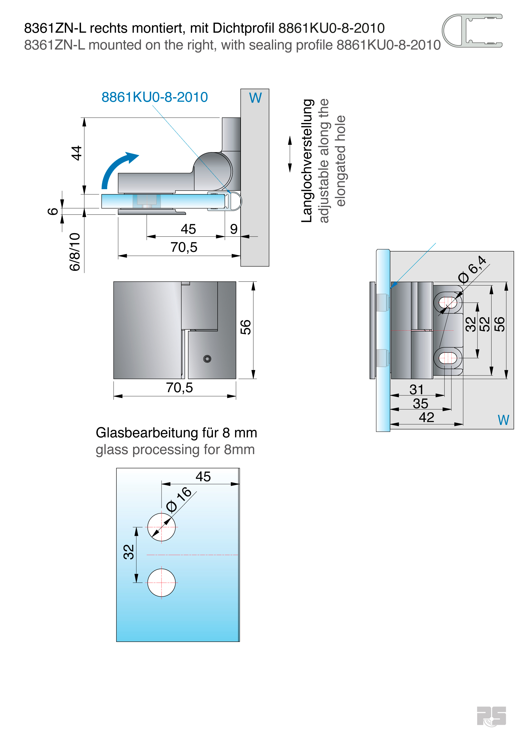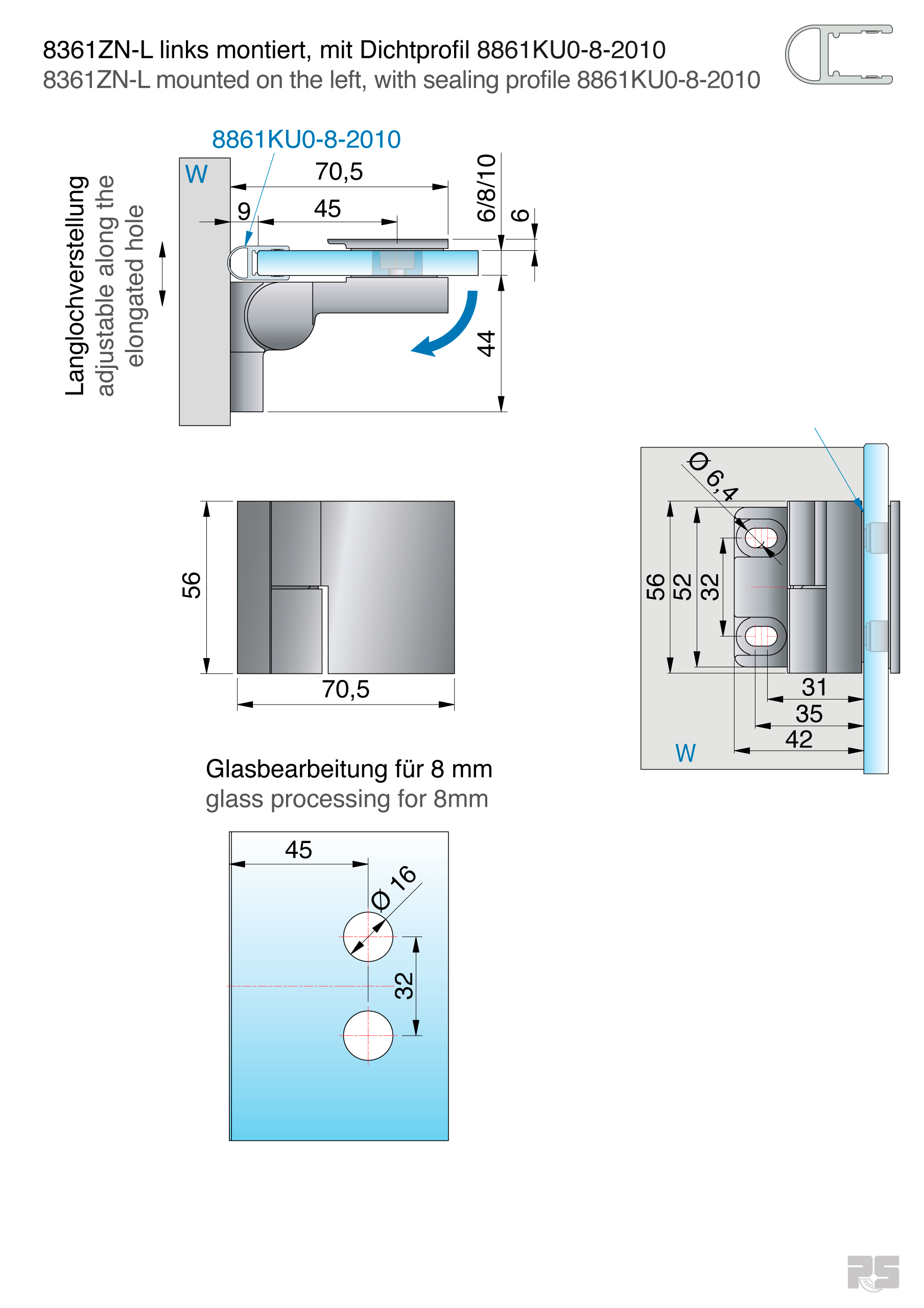 links montiert, 90° öffnend, Glasbefestigung mit Gegenplatte, Wandbefestigung mit Langlochverstellung, verdeckte Verschraubung mit Abdeckkappe, für beide Situationen montierbar, Nulllage einstellbar, Tragkraft/Paar: 36 kg