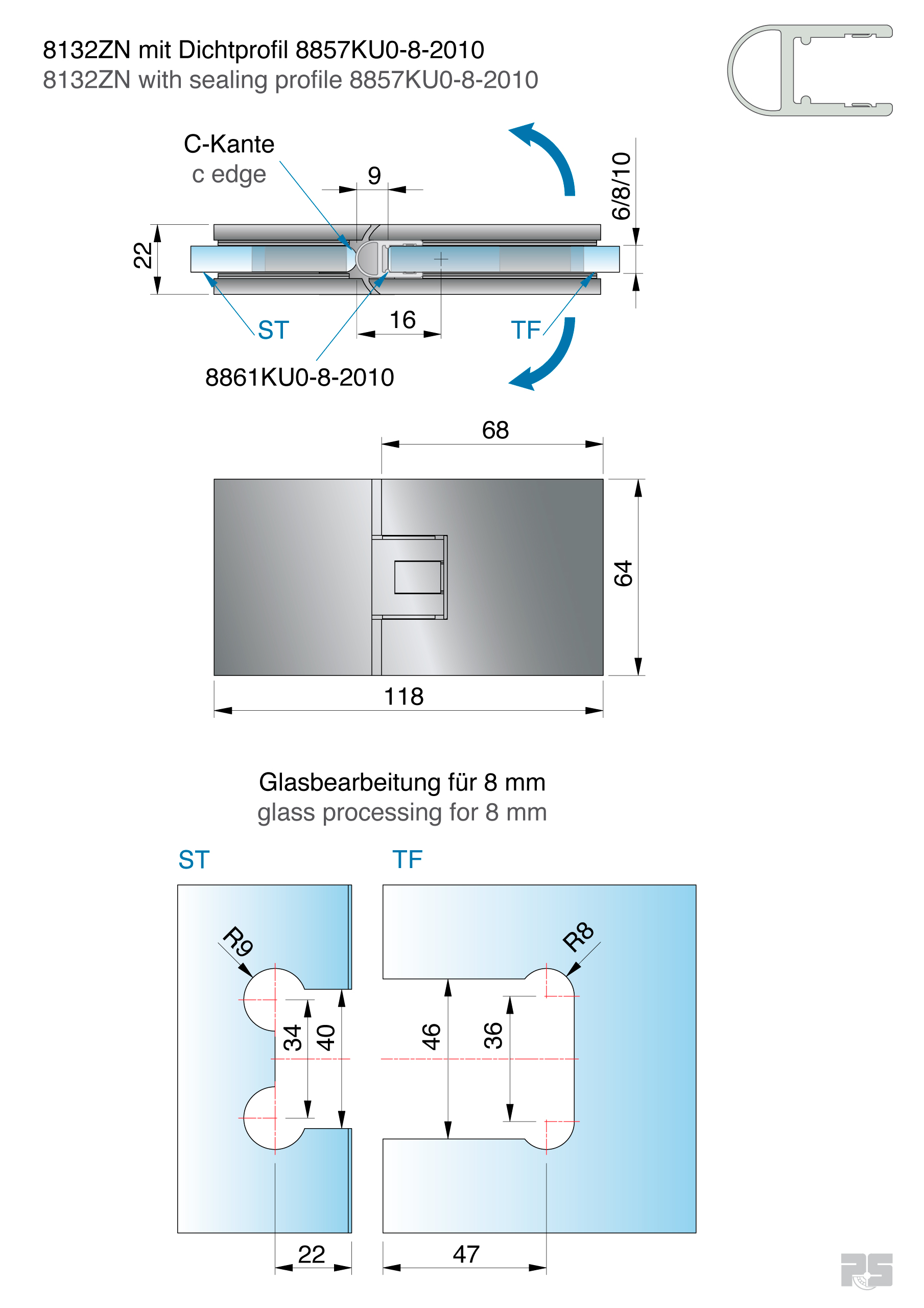 • Tragfähigkeit (2 Bänder): 45 kg entsprechen einer maximalen Türflügelgröße von 900 x 2000 mm bei 10 mm Glasdicke
