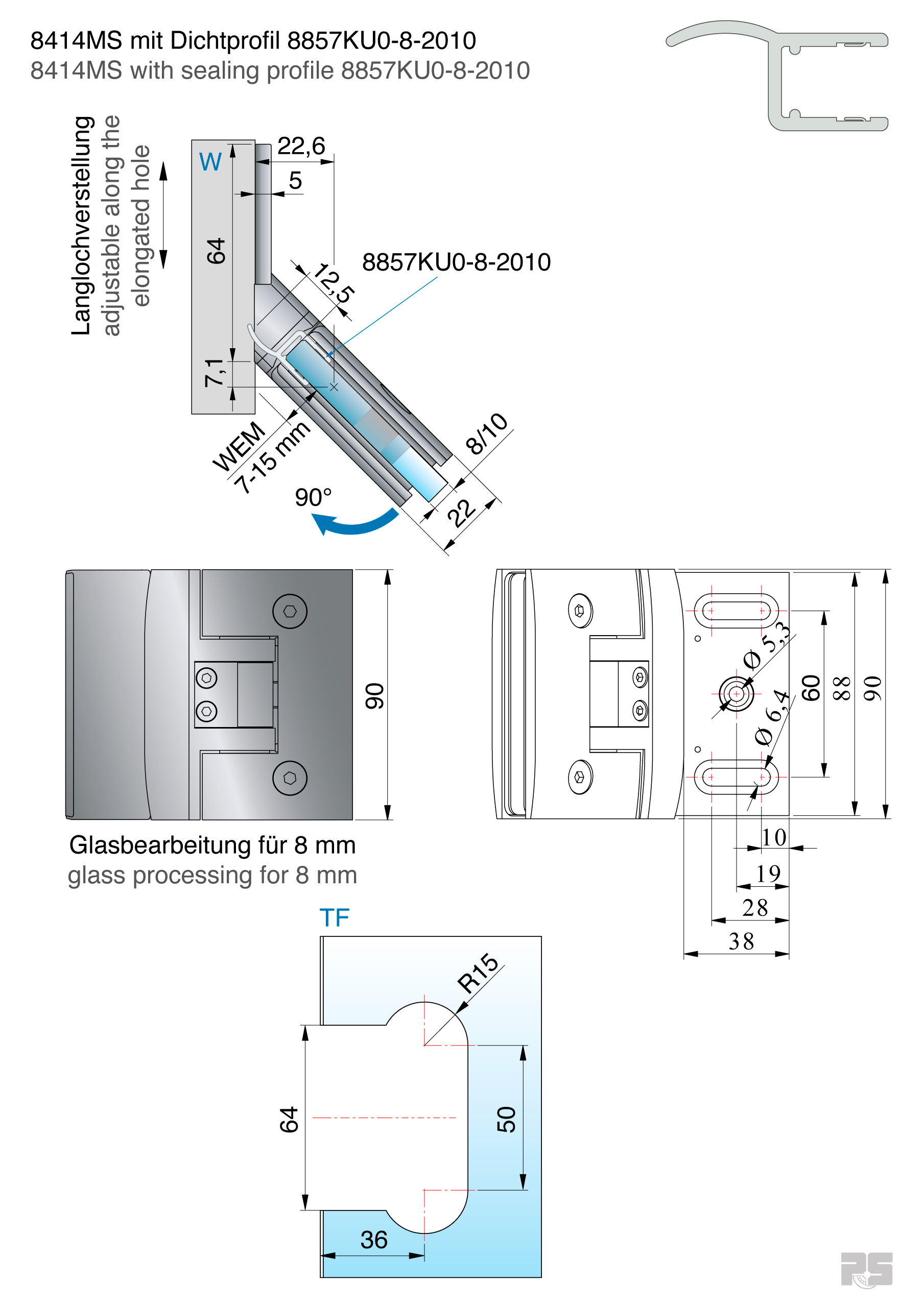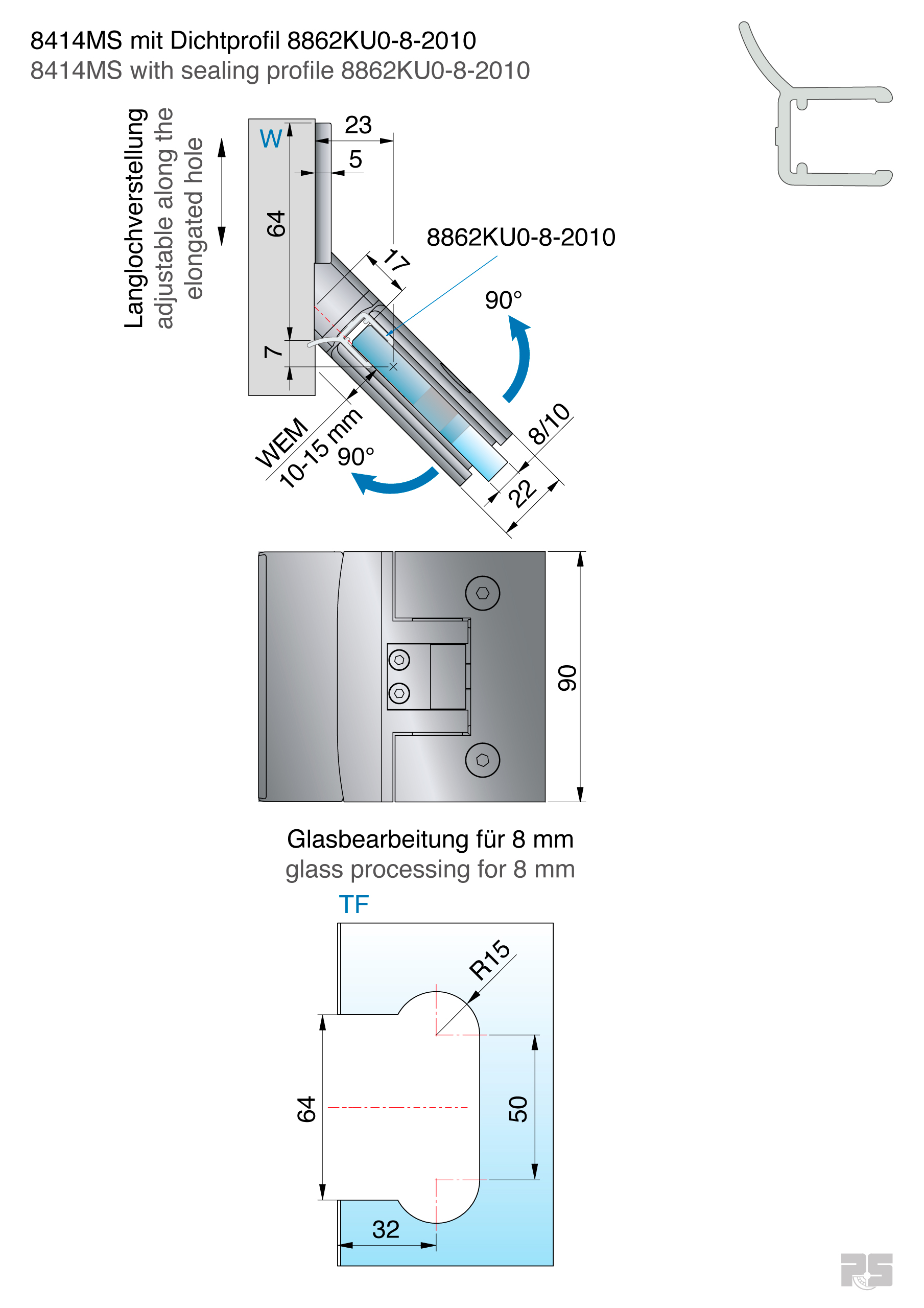 je nach verwendeter Dichtung beidseitig 90° öffnend, verstellbare Nulllage, Langlochverstellung, Tragfähigkeit/Paar: 50 kg