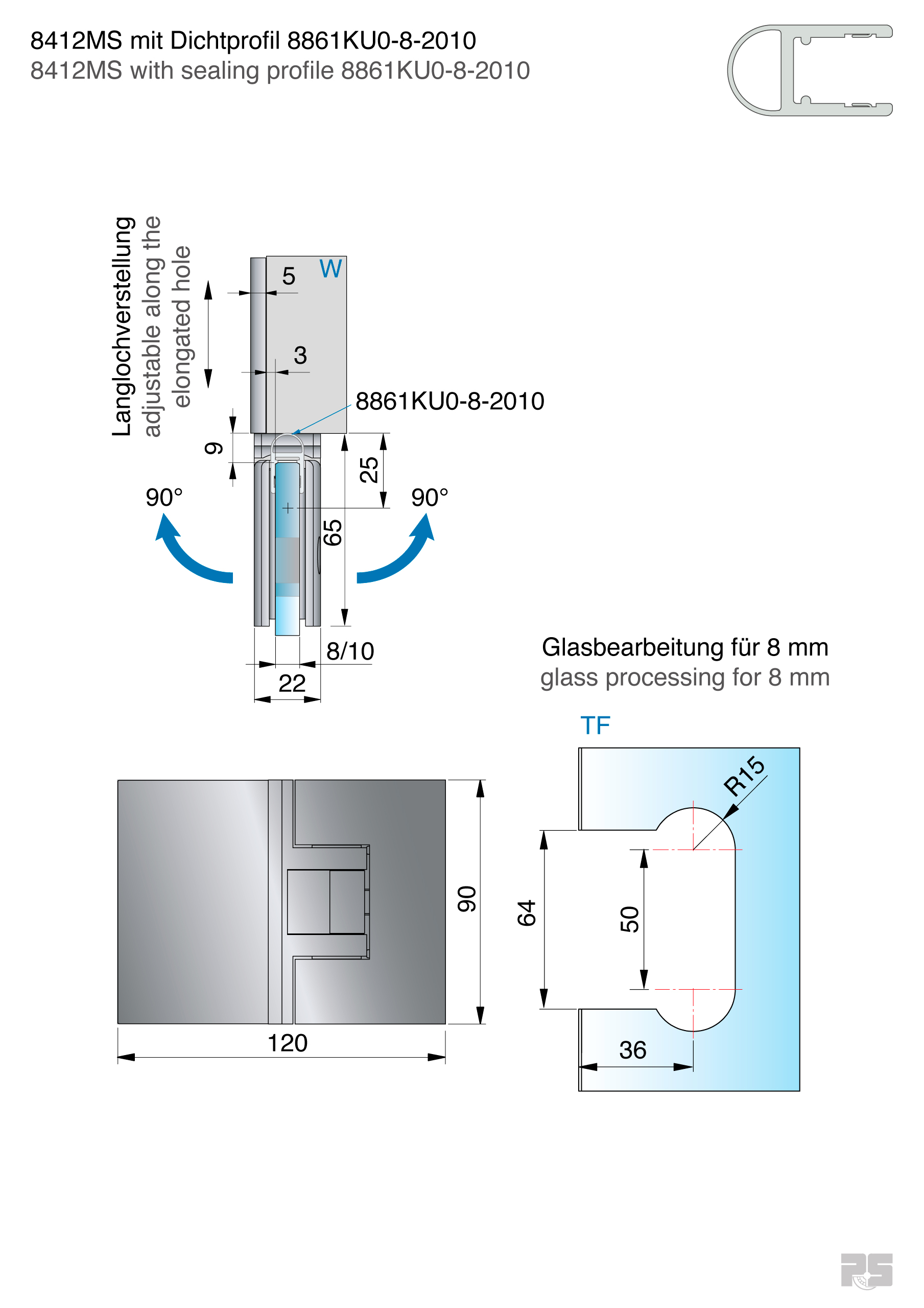 je nach verwendeter Dichtung beidseitig 90° öffnend, verstellbare Nulllage, Langlochverstellung, Tragfähigkeit/Paar: 50 kg