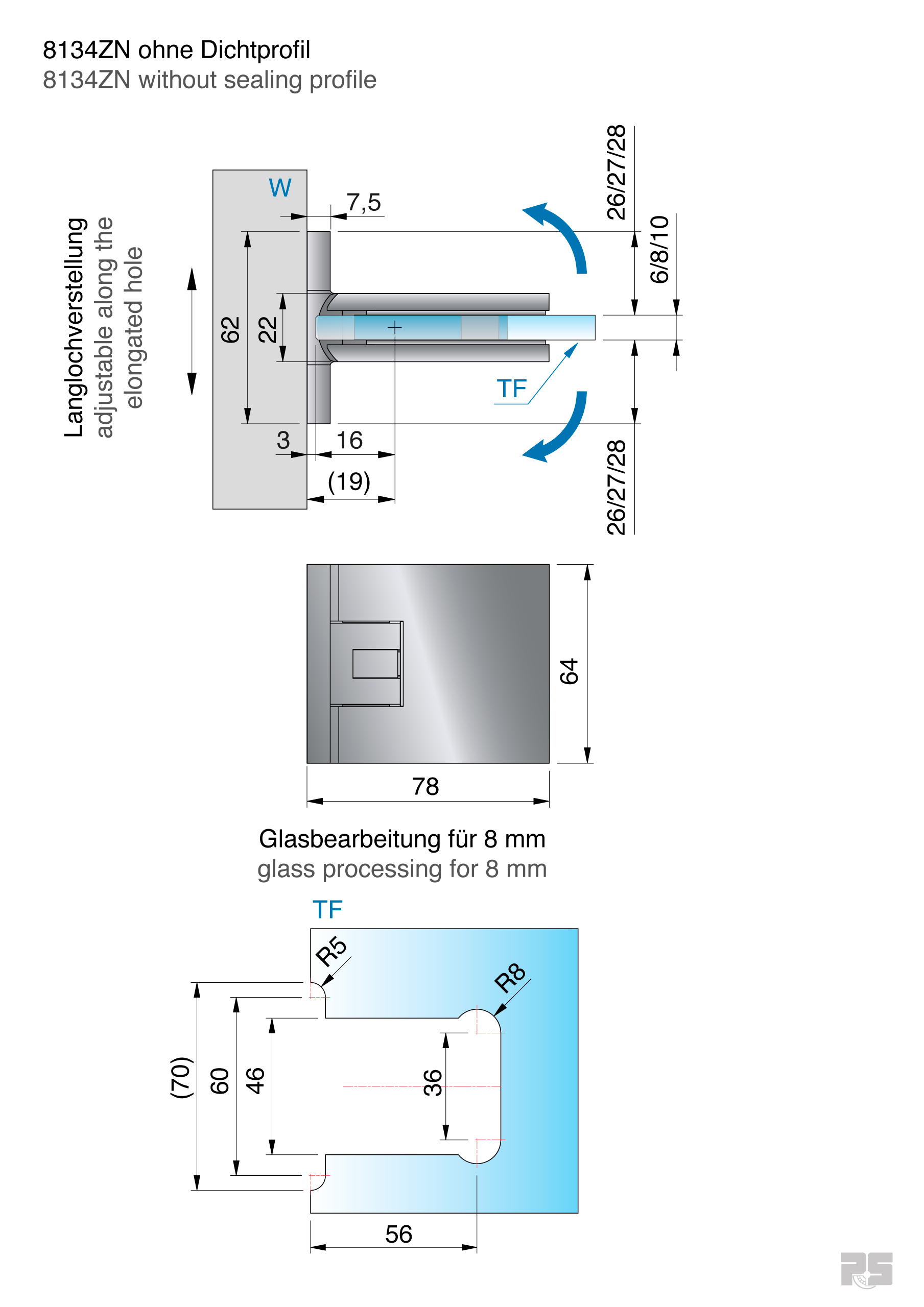 - Tragfähigkeit (2 Bänder): 45 kg entsprechen einer maximalen Türflügelgröße von 900 x 2000 mm bei 10 mm Glasdicke